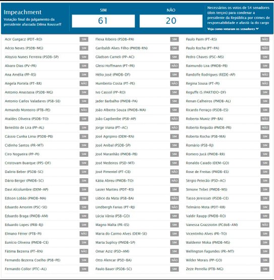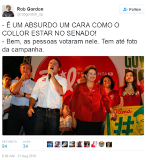 PS: Dilma foi cassada, mas não inabilitada. Numa chicana absurda o PT conseguiu garantir a salvação pra ela e…. pro Cunha (42x36x3). Agora ele pode até ser cassado, mas os colegas não vão retirar seus direitos políticos. Até na saída o PT faz merda e ajuda o Cunha, impressionante!