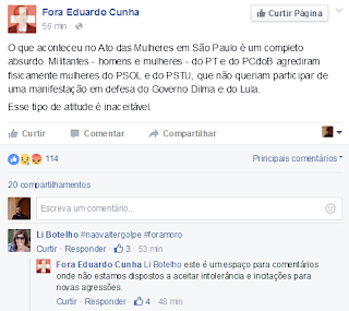 O perfil ainda denunciou que ativistas do PT e do PCdoB estariam defendendo as agressões nas redes sociais: