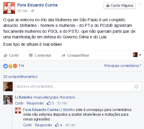 O que aconteceu no Ato das Mulheres em São Paulo é um completo absurdo. Militantes – homens e mulheres – do PT e do PCdoB agrediram fisicamente mulheres do PSOL e do PSTU, que não queriam participar de uma manifestação em defesa do Governo Dilma e do Lula.